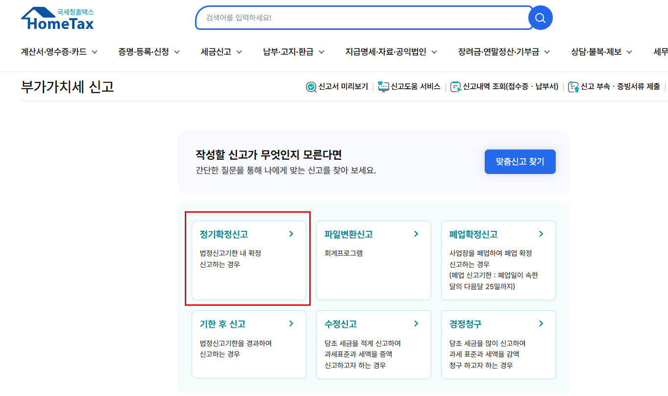 - 1기 확정 신고: 1월 1일 ~ 6월 30일의 부가세를 7월 25일까지 신고